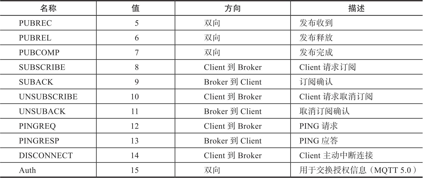 MQTT协议数据包的固定头的第一个字节的高4位用于指定该数据包的类型。MQTT协议数据包类型如表3-1所示。