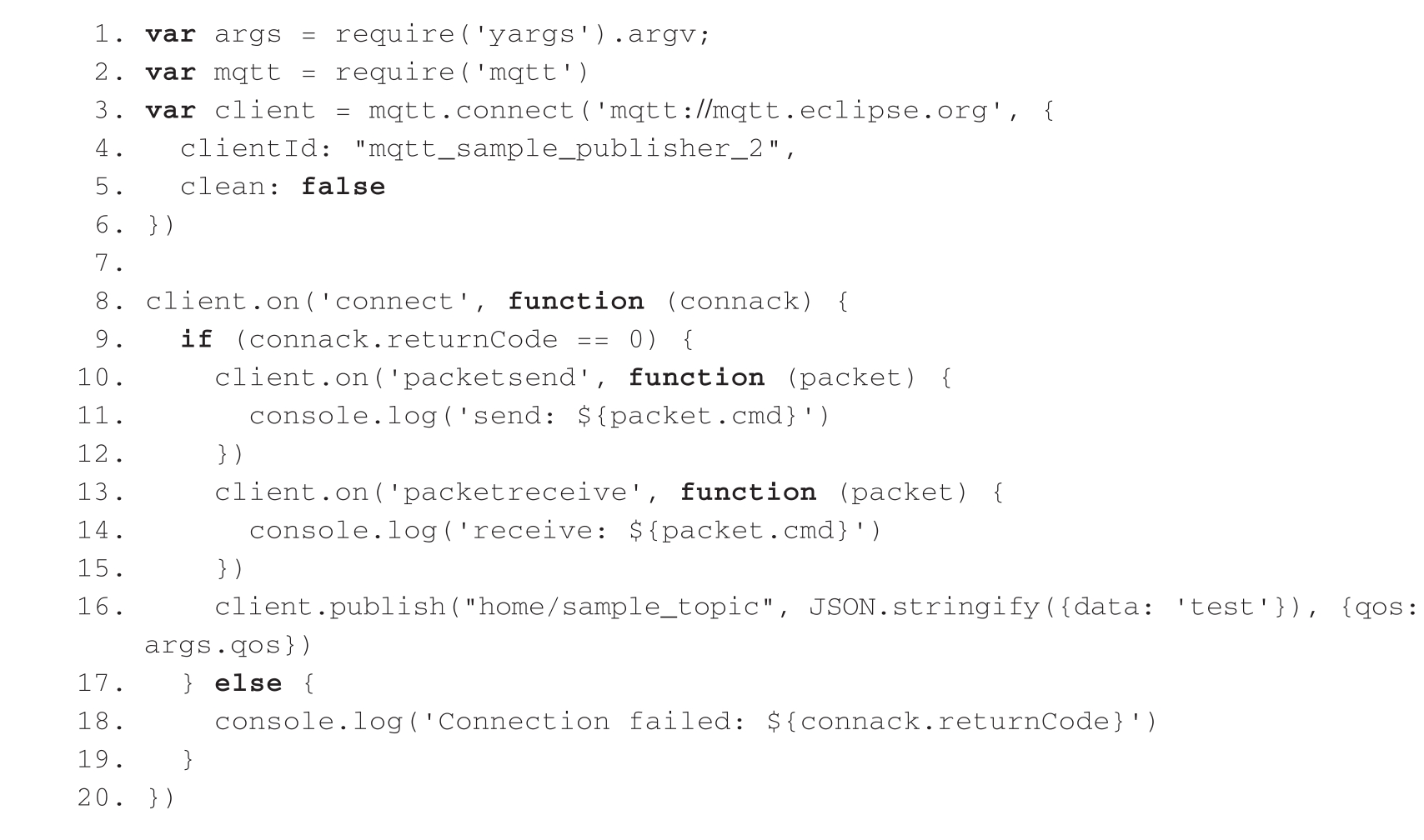 然后再编写一段Client代码,这个Client每隔4秒发布一条消息,完整的代码keepalive_with_publish.js如下所示。