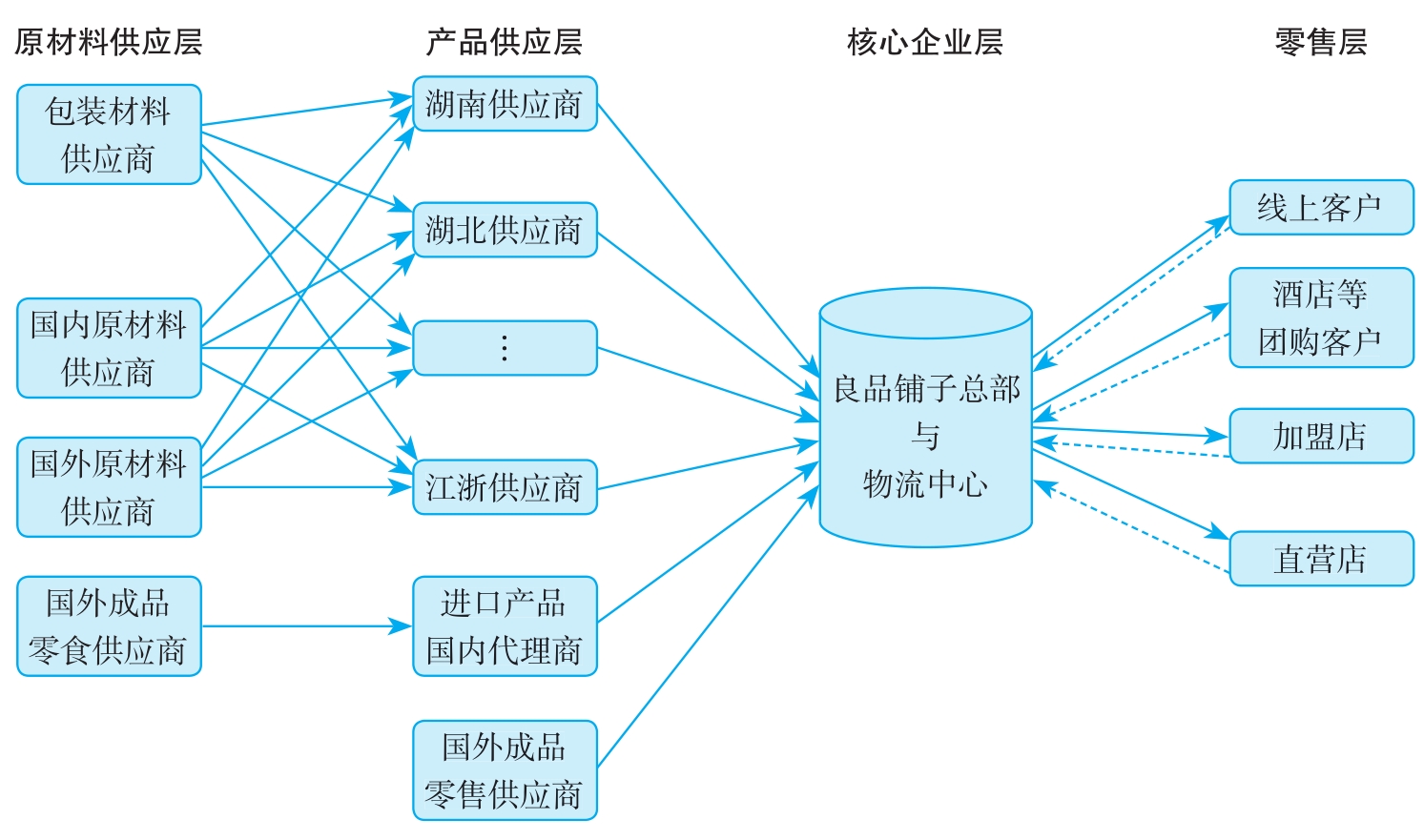 图1-7是良品铺子的供应链结构图。从图中可以看出,良品铺子的日常运作所处的供应链共有四层。从下游至上游,依次为零售层、核心企业层、产品供应层以及原材料供应层。