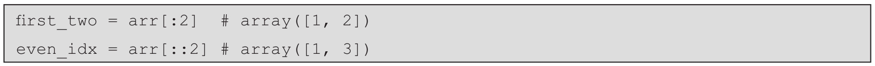 它还可以用于从现有数组中提取数据数组的常用切片语法。数组的切片还是一个数组,其中包含由切片指定的元素。例如,我们可以检索ary数组的前两个元素,或者检索ary数组的偶数索引处的元素,如下所示: