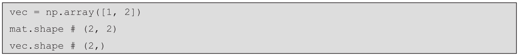 NumPy将形状存储为array对象上的shape属性,该属性是一个元组。该元组中的元素数量就是数组的维数: