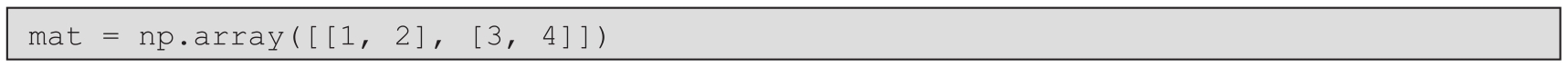 NumPy可以创建任意维数的数组,使用的是与创建简单一维数组相同的array例程。数组的维数由提供给array例程的嵌套列表的数量指定。例如,我们可以通过提供列表的列表来创建二维数组,其中内层列表的每个元素都是数字,如下所示: