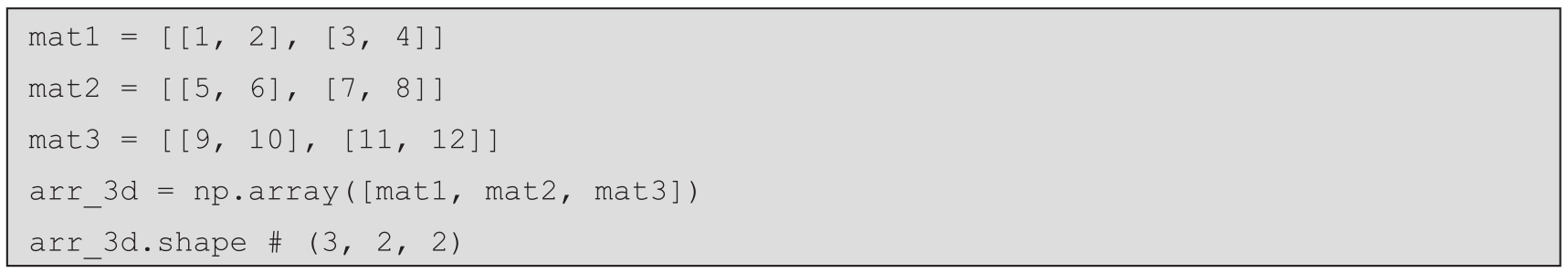要创建更高维度的数组,只需添加更多级别的嵌套列表。为了更清晰地说明这一点,在下面的例子中,我们在构建数组之前分离出第三维中每个元素的列表: