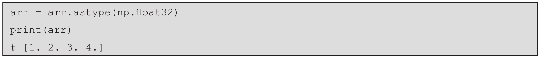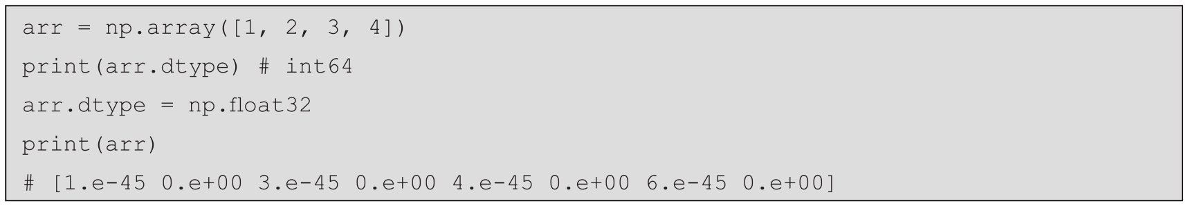 创建后,可以使用数组的dtype属性访问数据类型。修改dtype属性会产生不良后果,因为构成数组数据的原始字节将被简单地重新解释为新的数据类型。例如,如果使用Python整数创建数组,NumPy会将这些整数转换为数组中的64位整数。更改dtype值将导致NumPy将这些64位整数重新解释为新的数据类型: