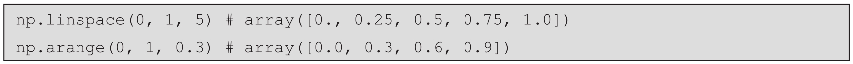 请注意,使用linspace生成的数组正好有5个点,这是由第三个参数指定的,这5个点中包括两个端点0和1。而使用arange生成的数组有4个点,不包括右端点1,如果再加一个步长0.3,则将等于1.2,这就大于1了。