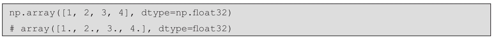 NumPy为许多C类型提供了类型说明符,这些类型可以传递到dtype参数中,例如,先前使用的np.float32。一般来说,这些类型说明符的形式为namexx,其中name是类型的名称(例如int、float或complex),而xx是位数,例如8、16、32、64、128。通常,NumPy在为给定的输入选择适当的数据类型方面做得相当不错,但偶尔你可能会想要覆盖它。前面的例子就是一个很好的例子,如果没有dtype=np.float32参数,则NumPy会假定它的类型为int64。
