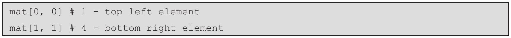 要访问多维数组中的元素,可以使用通常的索引表示法,但是与提供单个数字不同,你需要在每个维度中提供索引。对于2×2矩阵,这意味着指定所需元素的行和列:
