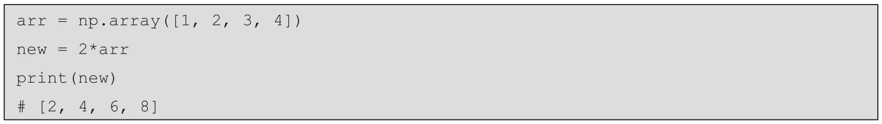 请注意,这里的数组必须具有相同的形状,也就是说,它们必须具有相同的长度。对不同形状的数组进行算术运算将会抛出ValueError异常。数组与单个数字进行加法、减法、乘法或除法运算将生成一个数组,相应运算作用于数组的每个元素。例如,我们可以使用以下命令将数组中的所有元素乘以2: