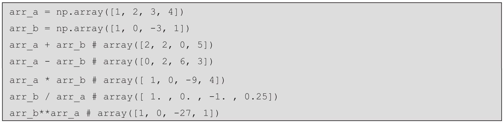 对NumPy数组的算术运算是逐元素进行的。以下示例最能说明这一点:
