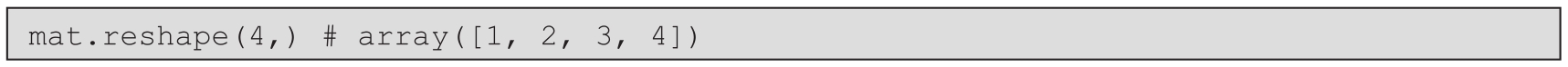 请注意,元素的总数必须保持不变。矩阵mat最初的形状是(2,2),总共有4个元素,而重塑后的数组是一个形状为(4,)的一维数组,同样有4个元素。如果在元素的总数不匹配时进行数组重塑,将导致ValueError错误。