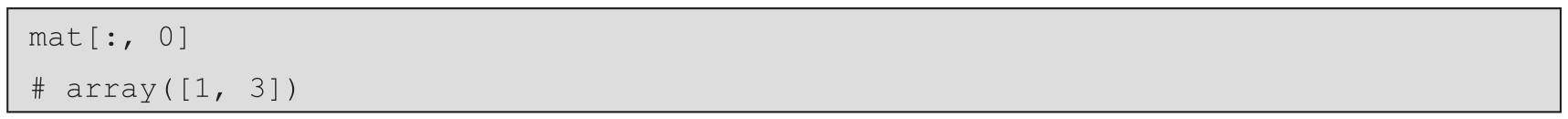 索引表示法还支持在每个维度中进行切片,因此我们可以通过使用切片mat[:,0]来提取单个列的所有元素,如下所示: