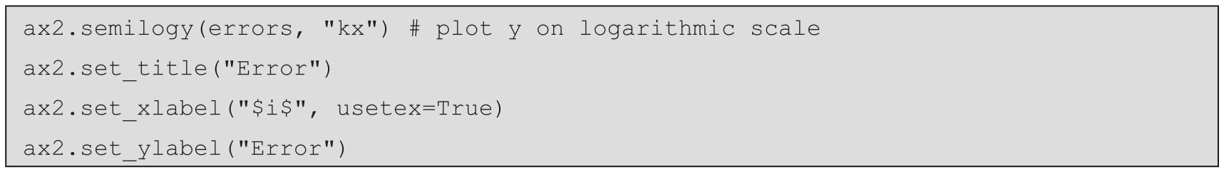 3.现在,我们可以使用ax2对象在第二个绘图形(显示在右侧)上绘制误差值。我们使用名为semilogy的另一种画图方法,它在y轴上使用对数刻度。这个方法的签名与标准的plot方法相同。同样,我们设置了轴标签和标题。如果你没有安装TeX,同样可以省略对usetex的使用: