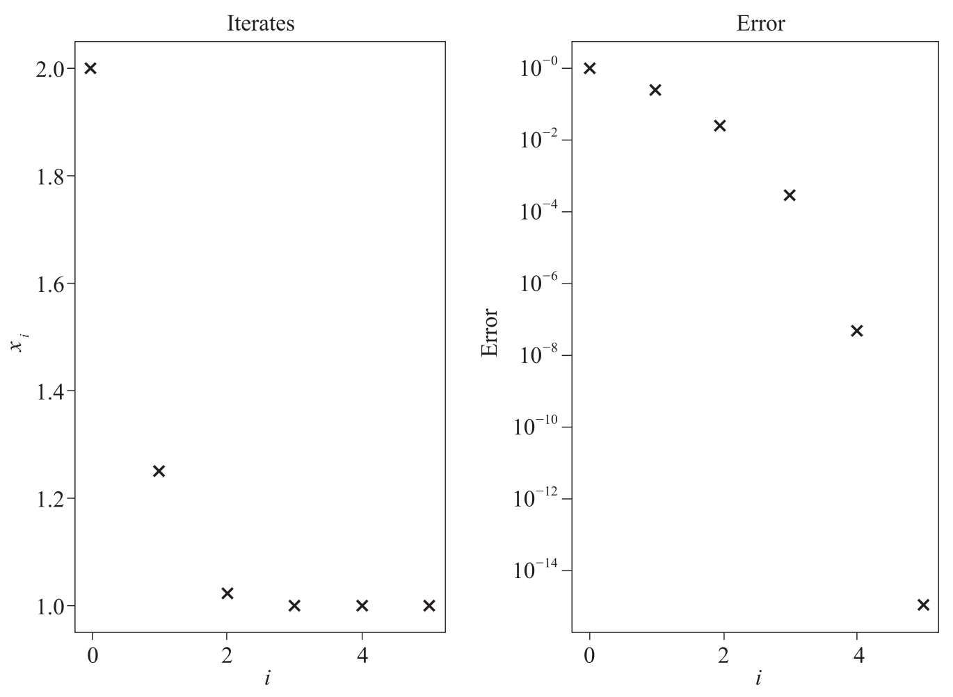 图2.3中,左图绘制了以牛顿法求解对函数的前五次迭代结果,右图则以对数刻度绘制了结果的近似误差。