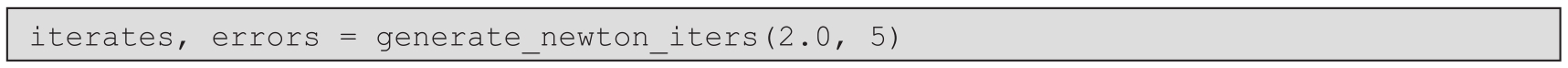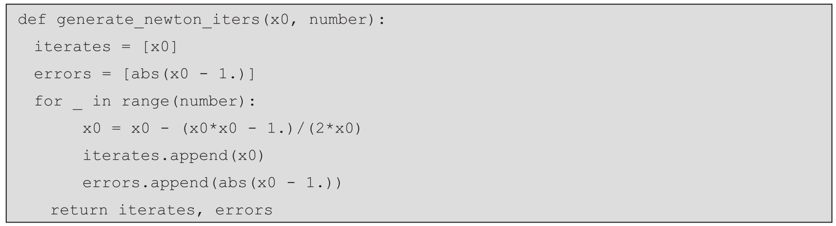 这个例程会生成两个列表。第一个列表包含对函数应用牛顿法求解的数值,第二个列表包含近似值的误差: