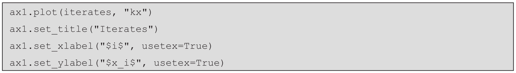 你需要准备绘制每个子图的数据。作为示例,我们将在第一个子图上绘制对函数 f ( x )= x 2 -1进行牛顿法(Newton's method)求解的前五次迭代结果,初始值为 x 0 =2;而在第二个子图上,我们将绘制迭代的误差。首先,我们定义一个生成器函数以获取迭代值: