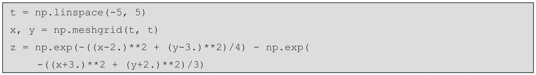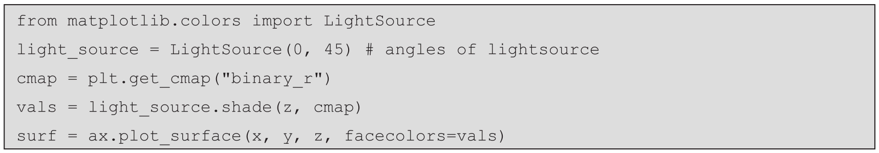 对于更高级的用途,Matplotlib提供了一个接口,用于使用光源创建自定义的阴影。该接口通过从matplotlib.colors包导入LightSource类,然后使用该类的实例根据 z 值对曲面元素产生阴影。这是使用LightSource对象的shade方法实现的:
