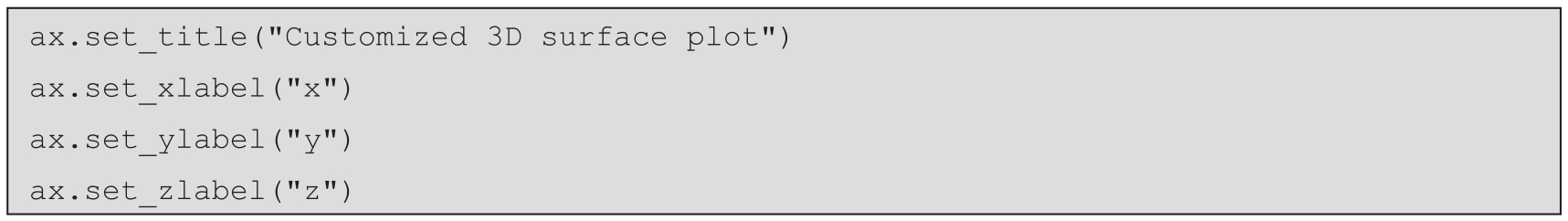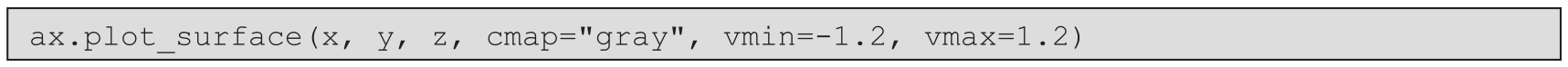 等高线图可能会隐藏它所代表的曲面的一些细节,因为它只显示“高度”相同的位置,而不显示值是多少,甚至不显示与周围值的关系。在地图上,可以通过将高度输出到某些特定等高线上来解决上述问题。曲面图更具表现力,但将三维对象投影到二维屏幕上的问题本身可能会掩盖一些细节。为了解决这些问题,我们可以自定义三维图(或等高线图)的外观,对图形效果进行增强,并确保我们希望突出显示的细节清晰可见。最简单的方法是更改图形的颜色图,正如我们在前面的示例中看到的那样(默认情况下,Matplotlib会生成单色的曲面图,这使得我们在印刷品上难以看到细节)。在接下来的示例中,我们将探讨一些其他自定义三维曲面绘图的方法,包括更改显示的初始视角和更改颜色图的归一化方法等。