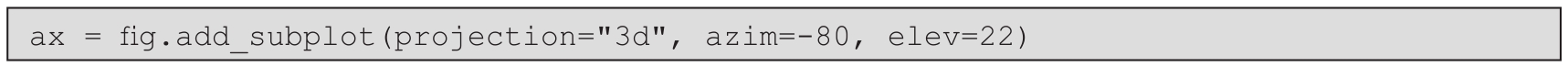 2.现在,我们需要在这个figure对象上添加新的Axes3D对象,除了设置我们之前见过的projection="3d"关键字参数以外,还可以通过设置azim和elev关键字参数来改变初始视角: