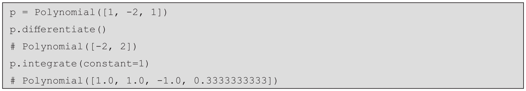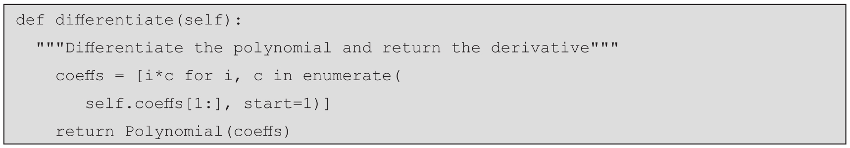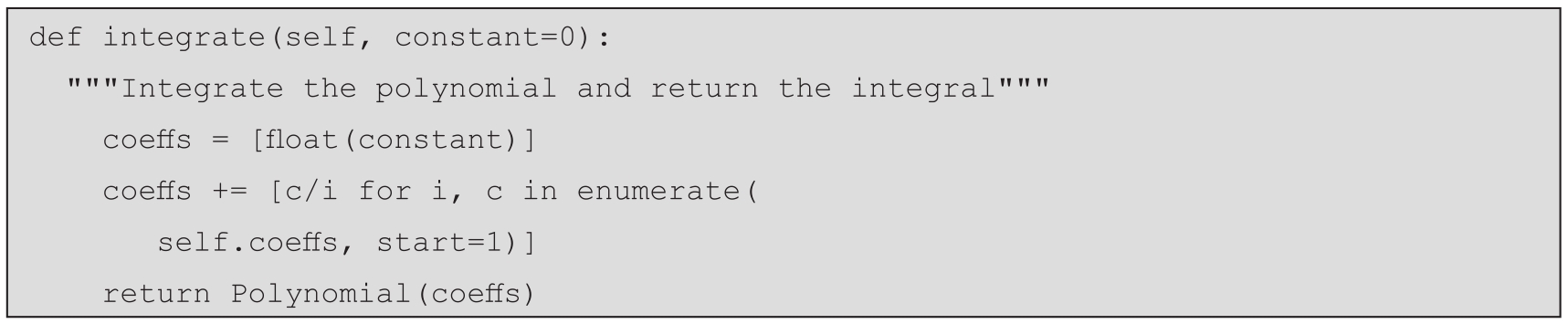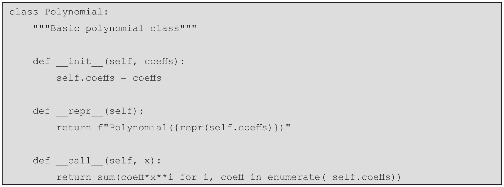 我们在这个示例中定义的Polynomial类相对简单,但代表了核心思想。一个多项式可以由其系数唯一确定,我们可以将这些系数存储为数值列表,对这个系数列表进行微分和积分运算。我们提供了一个简单的_repr_方法来帮助显示Polynomial对象,并提供了调用方法_call_,以方便对特定数值进行求值,这里主要演示了多项式的求值方式。