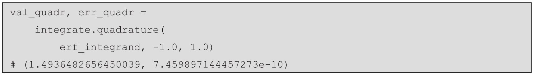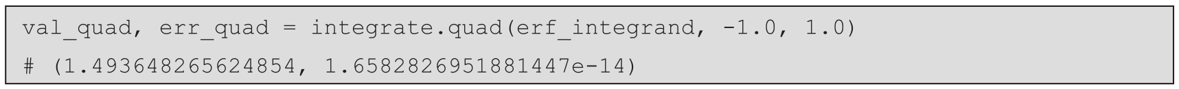2.quad例程是一种通用的积分工具。它需要三个参数,即待积分的函数(erf_integrand)、下限(-1.0)和上限(1.0):