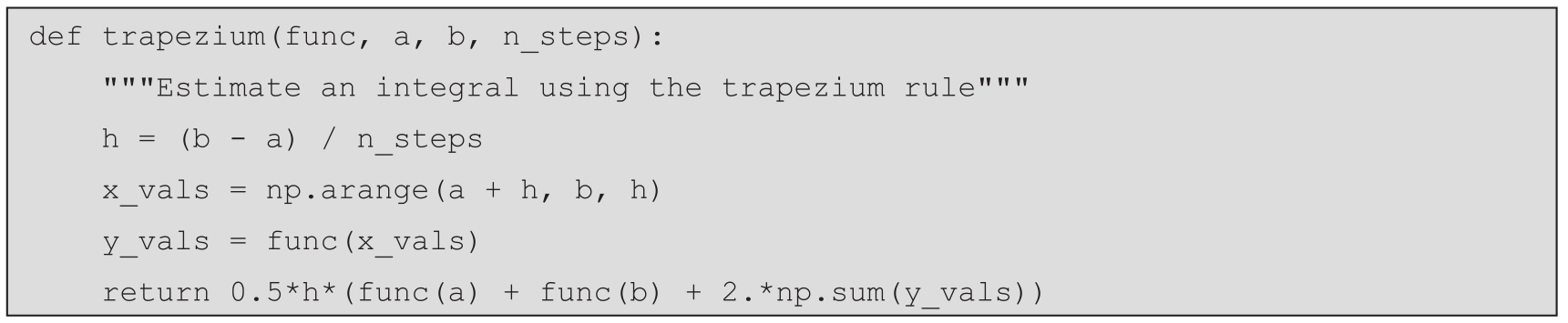 这里, a < x 1 < x 2 <…< x n -1 < b ,而 h 是相邻的 x i 值之间的差值(这里 h 相同),包括端点 a 和 b 。这可以用Python实现如下: