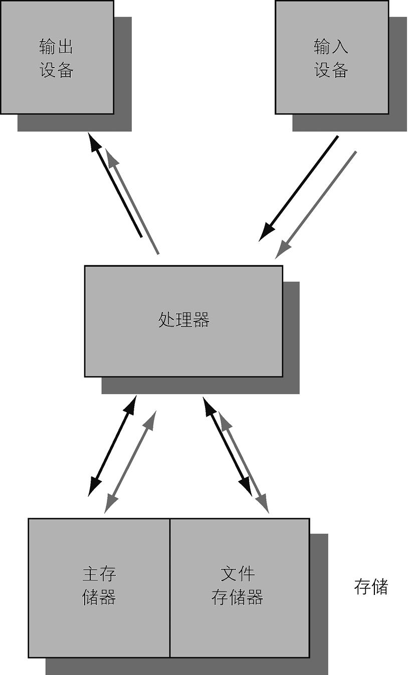 图1中还显示了存储。数据和程序存储在两个存储区。第一个被称为主存储器,它的特性是,无论存储在那里的是什么,都可以非常迅速地检索出来。主存储器用于存储瞬态数据—例如,一个计算的结果,它是一个更大计算的中间结果—也用于存储正在执行的计算机程序。主存储器中的数据是暂时的—当计算机关闭时,它就会消失。