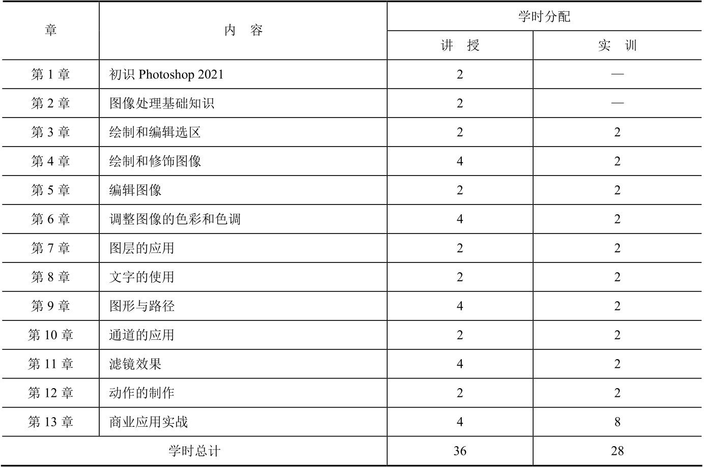 Photoshop是由Adobe公司开发的图形图像处理和编辑软件。它功能强大、易学易用,深受图形图像处理爱好者和平面设计人员的喜爱。目前,我国很多高等职业院校的数字媒体类专业都将“Photoshop”列为一门重要的专业课程。为了帮助教师全面、系统地讲授这门课程,使学生能够熟练地使用Photoshop进行创意设计,我们几位长期从事Photoshop教学的教师共同编写了本书。