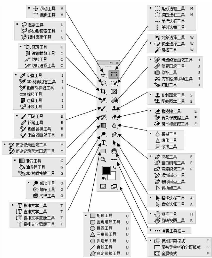Photoshop 2021的工具箱提供了强大的工具,包括选择类工具、绘图类工具、填充类工具、编辑类工具、颜色选择类工具、屏幕视图类工具、蒙版类工具等,如图1-8所示。