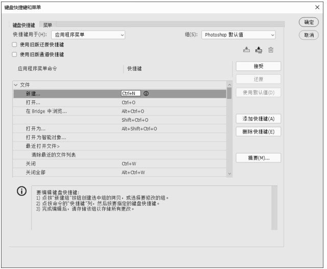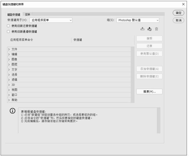 (3)自定义键盘快捷方式。为了更方便地使用最常用的命令,Photoshop 2021为用户提供了自定义键盘快捷方式、保存键盘快捷方式等功能。