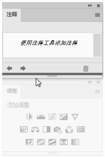 拖曳控制面板的选项卡到另一个控制面板的下方,当出现一条蓝色粗线时,如图1-20所示,松开鼠标左键即可将两个控制面板连在一起,效果如图1-21所示。