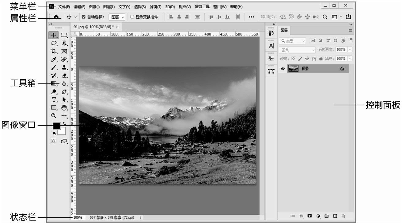 会使用工作界面是学习Photoshop 2021的基础。熟悉工作界面的内容,有助于广大初学者日后得心应手地使用Photoshop 2021。Photoshop 2021的工作界面主要由菜单栏、属性栏、工具箱、控制面板、图像窗口和状态栏组成,如图1-1所示。