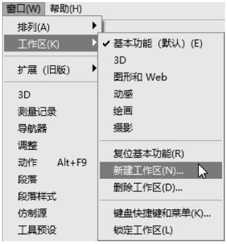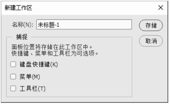 选择“窗口 > 工作区 > 新建工作区”命令,如图1-22所示。弹出“新建工作区”对话框,如图1-23所示,输入工作区名称,单击“存储”按钮,即可将自定义的工作区存储。