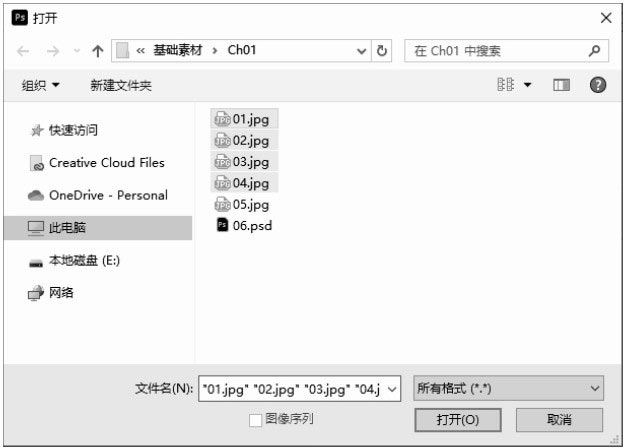 在Photoshop 2021的图像窗口中双击,弹出“打开”对话框。在“打开”对话框中,按住Ctrl键的同时单击要打开的文件,如图1-44所示,然后单击“打开”按钮,效果如图1-45所示。