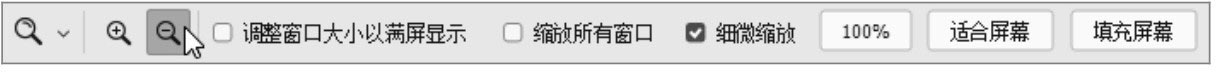 (2)使用属性栏。在“缩放”工具的属性栏中单击“缩小”按钮