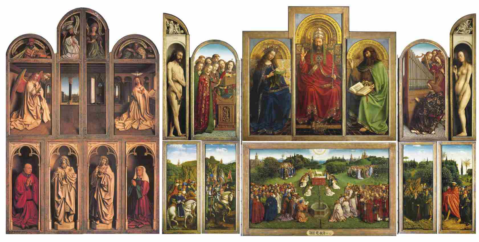 每当节日盛会,祭坛画的侧翼伴随音乐打开,露出内部十二幅绚烂的杰作,分列上下两层。上层中心部分以压缩距离感的短缩法画成,其形象是上帝还是基督,一直存在争议。圣母与施洗者圣约翰分列左右,二者身后是天使合唱团与演奏团。有意思的是,天使们没有翅膀,样貌如日常所见之人,连发音的口型和乐器的形制也被准确描绘。最外侧的亚当和夏娃是裸体的,接近真人大小,这在当时的尼德兰是首创。逼真的表现也带来了麻烦,直到19世纪,每当展出这件作品时,人们仍然要以着衣的复制品取而代之。亚当和夏娃被限定在一个非常狭小的空间里,动作像是要冲出这个空间。这幅祭坛画总长5.2米,超出当时教堂的宽度,侧翼不能完全打开,这让亚当和夏娃相向而行的态势更具立体感。