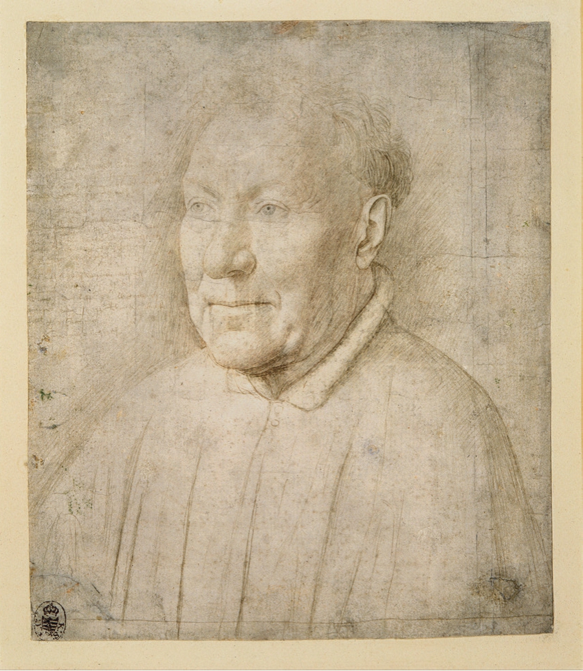 可能是在为菲利普三世执行外交任务时,凡·艾克在安特卫普结识了教皇玛尔定五世的外交官、红衣主教尼科洛·阿尔贝加蒂(Niccolò Albergati),并接受肖像画委托。这次委托的素描稿(图2.2)留存了下来,可以看出凡·艾克准备工作的细致程度。所有出现在油画上的细节,素描手稿里都事先阐明了。为了增加透视感,手稿里的耳朵和头颅被明显画小了。但在最终完成的《红衣主教尼科洛·阿尔贝加蒂肖像》( Portrait of Cardinal Niccolò Albergati ,图2.3)中,凡·艾克放弃了这一尝试,最终得到一个均衡的结果。