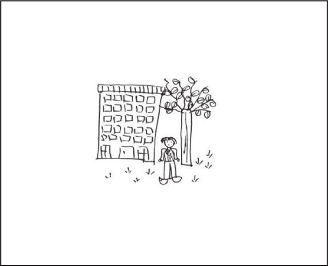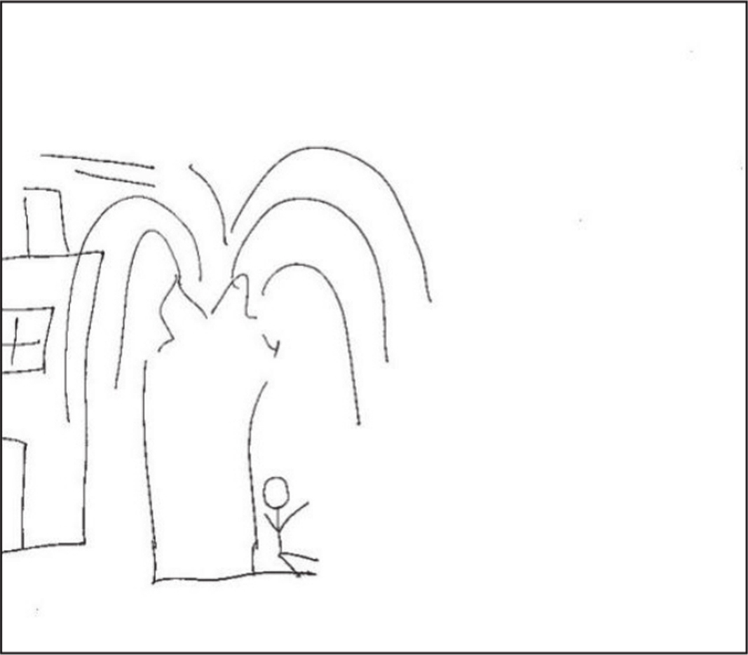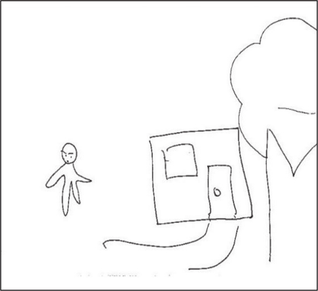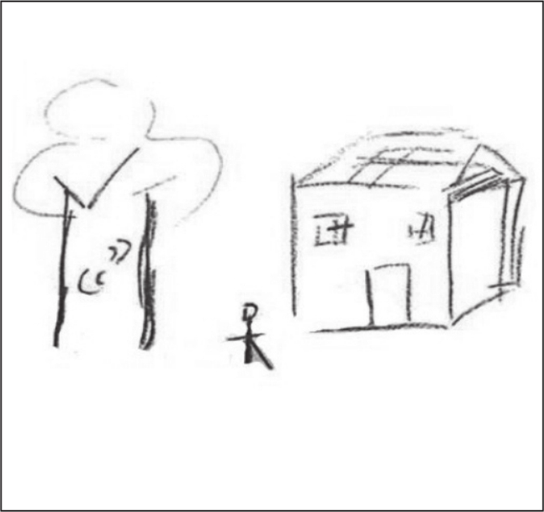 如图2-45所示,房子最先着笔,且人在房子里面,树在房子后面,提示依恋家庭,缺乏安全感。