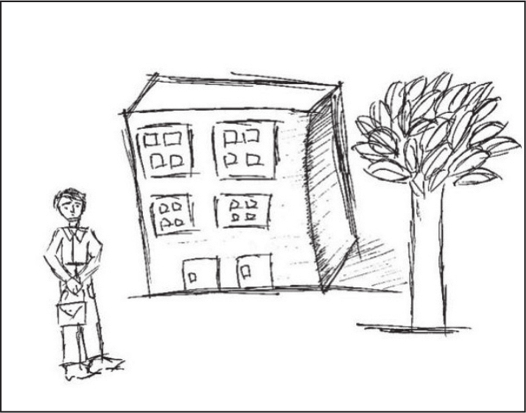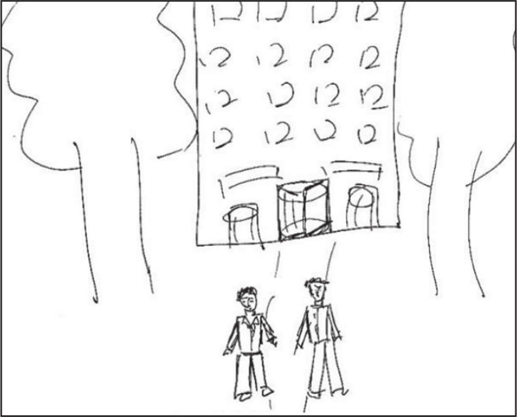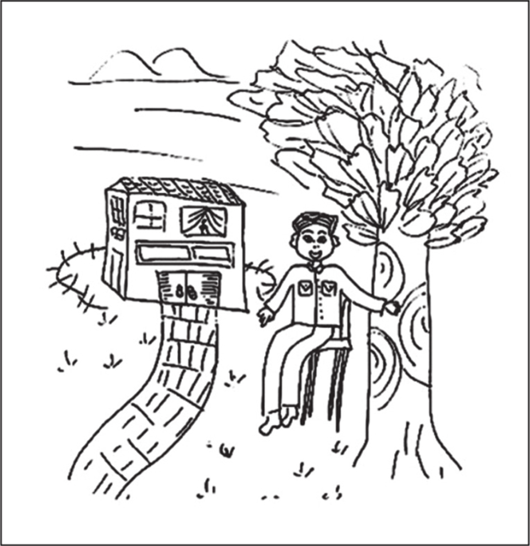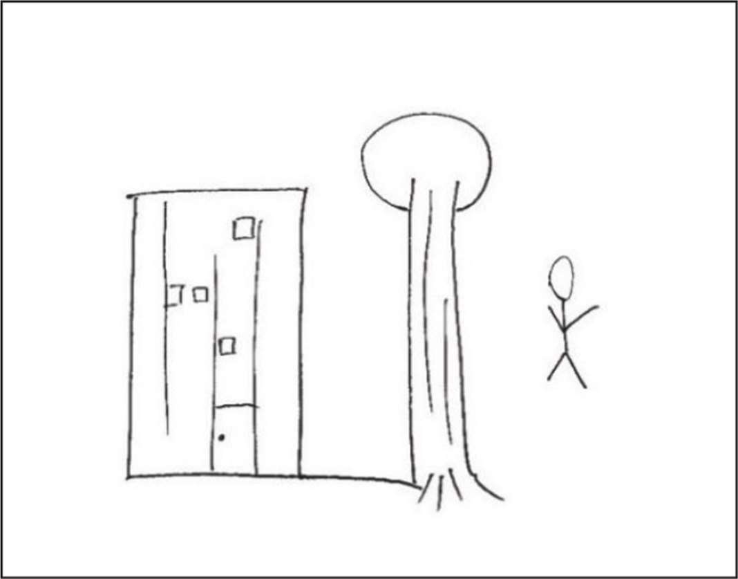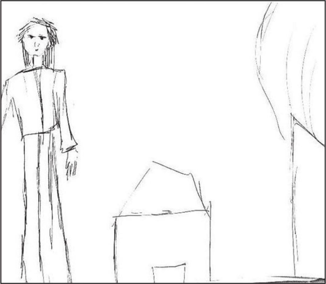 如图2-45所示,房子最先着笔,且人在房子里面,树在房子后面,提示依恋家庭,缺乏安全感。
