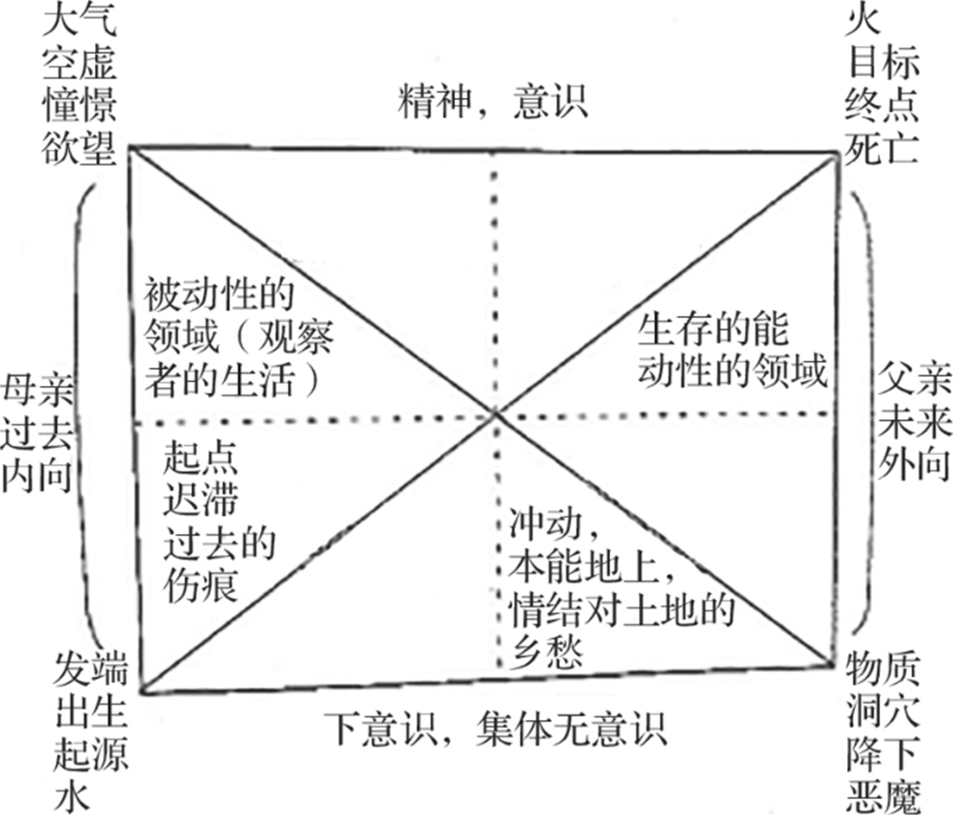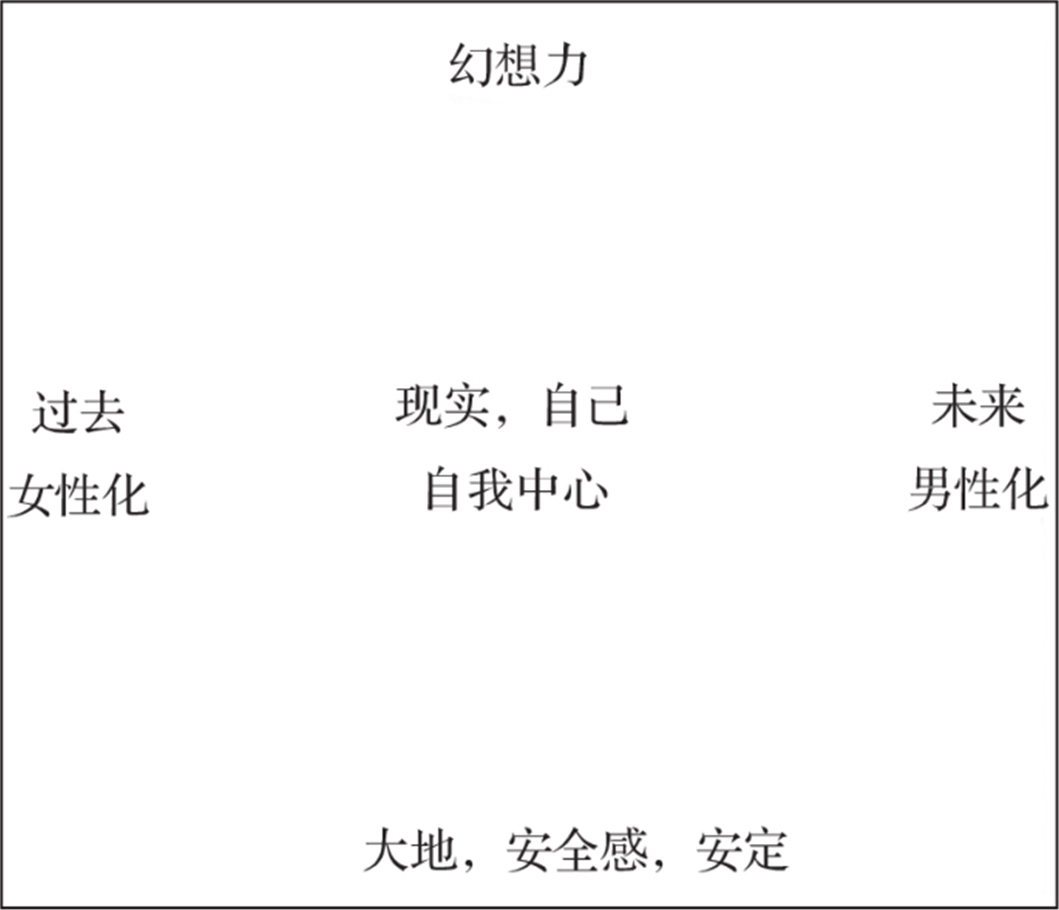 如图2-11所示,上为天,下为地。天代表高的目标,地代表依靠。靠近“天”画,易空想、幻想,有高目标;靠近“地”画,提示缺乏安全感,较为依赖。图2-12为格鲁尔德(Grunwald)的空间象征图示。 [31]