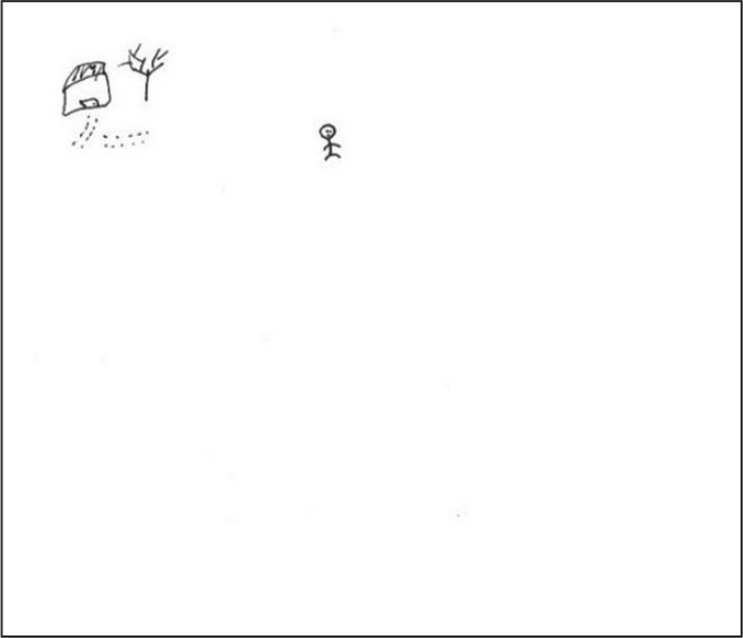 提示:画面<1/9纸说明画者自我评价较低的倾向;不适应环境,自我抑制;拘谨、腼腆和害羞的心理倾向;缺乏安全感;情绪低落;有退缩的倾向。