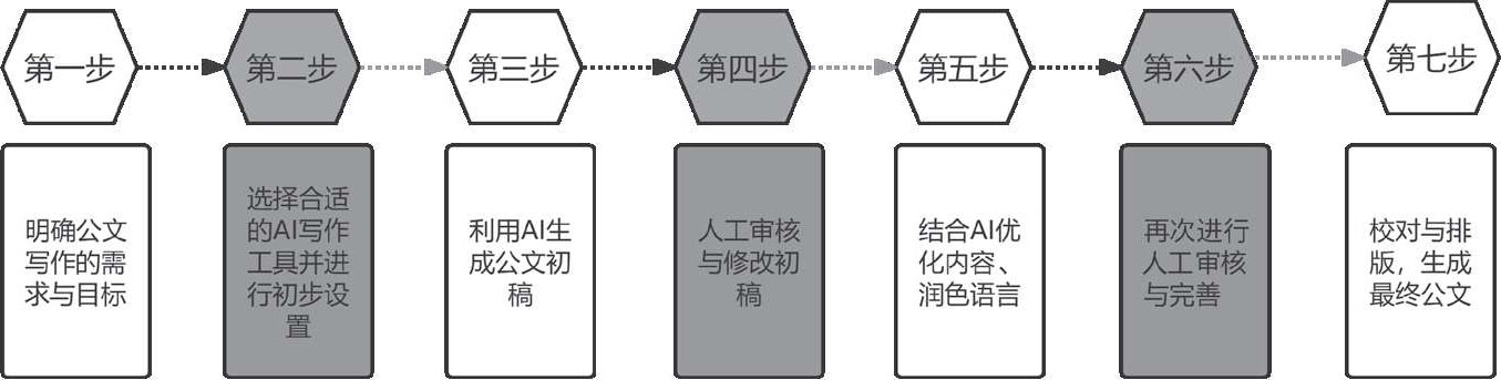 在政务办公场景中,公文写作是一项高度规范化、流程化的任务。借助AI技术,办公人员可以将传统的公文写作流程进行优化和升级,形成一套高效、科学的AI写公文七步法。在充分发挥AI优势的同时,结合人工审核和修改,确保公文的质量和合规性。以下是详细的实操流程。