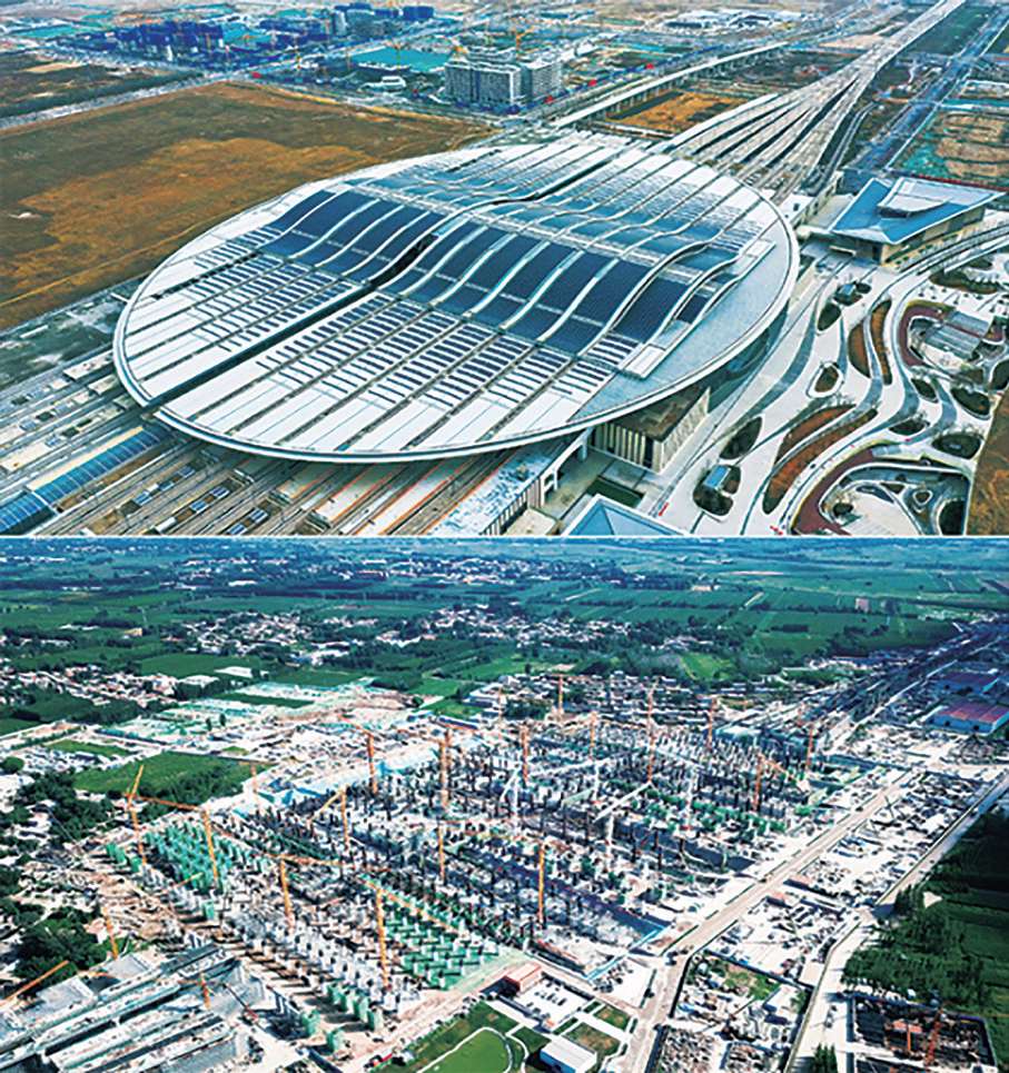 中国式现代化的蓝图是在中国共产党领导下一笔一画设计和描绘出来的。2017年,设立河北雄安新区的消息如春雷乍响,从白洋淀畔传遍大江南北。雄安新区,从“一张白纸”着墨,每天都在积蓄力量、不断发展。六载光阴,从顶层设计规划到如火如荼大规模建设,一座现代化的城市如今已显现雏形。图为拼版照片:上图为2023年3月23日拍摄的京雄城际铁路雄安站;下图为2019年8月29日拍摄的京雄城际铁路雄安站建设现场