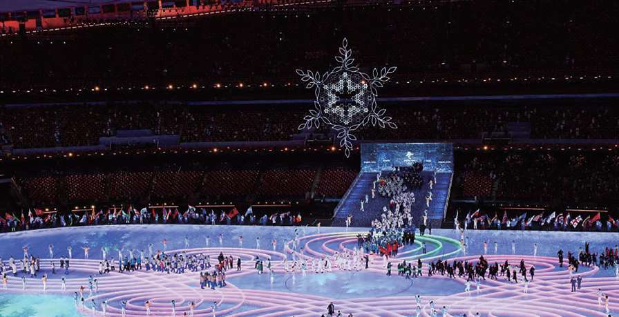 正是因为有党的坚强领导,总揽全局、凝聚力量、同向发力,北京冬奥会、冬残奥会筹办工作才能通力合作、密切配合,取得了令人满意的成绩。正是因为始终在党的领导下,集中力量办大事,组织有效、应对积极,哪怕在全球“新冠”疫情肆虐的艰难时刻,广大运动员、教练员、建设者、管理者等依然能够克服种种困难,保证筹办工作效果、力度不减,稳步有序地全面推进。图为2022年2月20日晚,第二十四届冬季奥林匹克运动会闭幕式在国家体育场举行,代表团旗帜和运动员入场