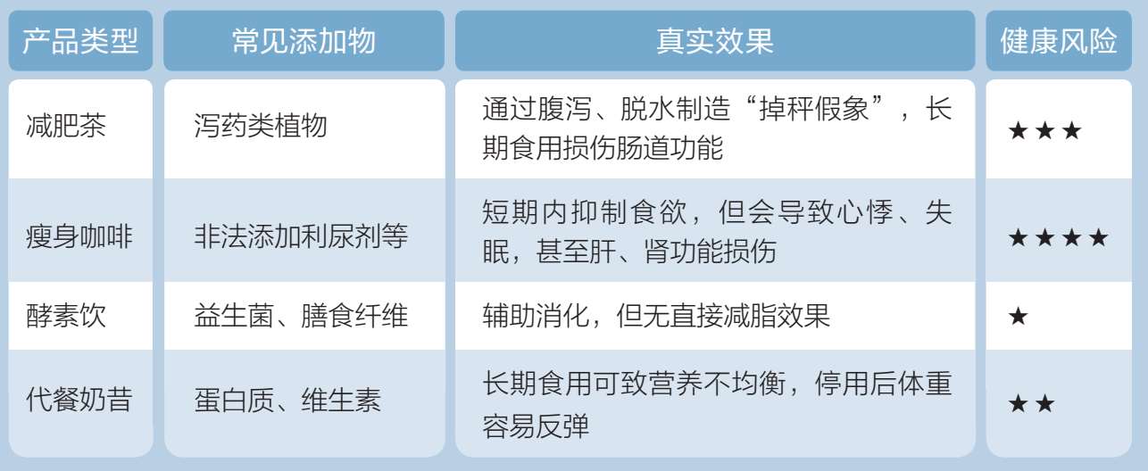 多数网售减肥产品并不靠谱!它们常打着“轻松瘦身”的旗号,实则暗藏健康风险。减肥茶、瘦身汤等产品往往利用泻药成分(如番泻叶、决明子等)制造“掉秤假象”,通过腹泻、脱水让体重短暂下降,但减去的只是水分,而非脂肪,长期使用可能损伤肠道功能,反弹率极高。号称“黑科技”的瘦身咖啡也很危险,非正规渠道购买的产品可能违法添加禁药,虽能短期抑制食欲,却可能导致心悸、失眠,甚至肝、肾功能损伤。