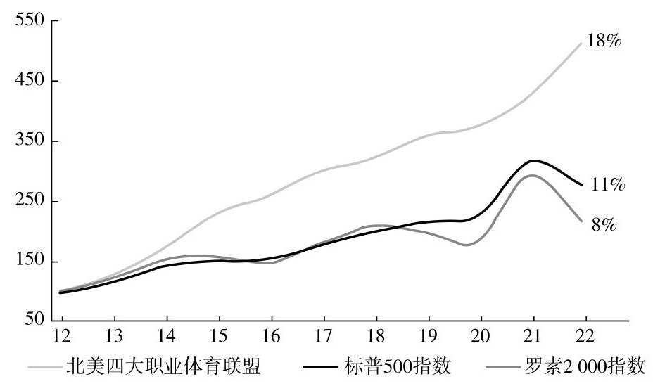 在2012年至2022年间,标准普尔500指数的年化回报率约为11%。罗素2 000指数(由小盘股组成的指数)的年化回报率约为8%。在同一时期,北美四大职业体育联盟(NBA、MLB、NFL和NHL)联合产生了惊人的18%的复合回报率(见图3-1)。更重要的是,这些回报几乎没有使用杠杆(由于联盟政策的限制),因此这些回报没有以任何方式被“夸大”。