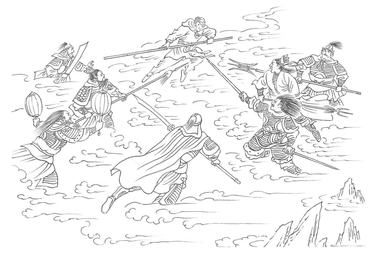 玉帝传下圣旨,请二郎神前去除妖。二郎神带着手下赶到花果山,叫开水帘洞门,与孙悟空交起手来。两人棋逢对手,连斗了三百多回合,仍难分胜负。天神们趁着二郎神与孙悟空缠斗之际,去捉拿花果山的猴兵猴将。可怜这些猴如何敌得过,一时纷纷抛戈弃甲,四处逃窜。