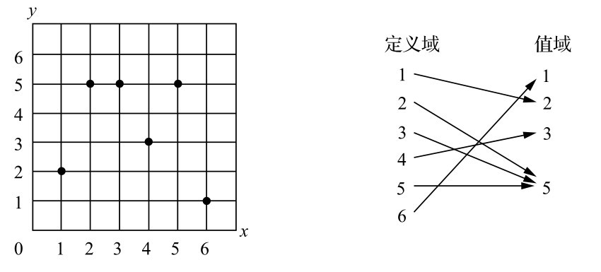 在现代集合论中,我们不是用方程,而是用一组规则来描述函数。定义函数的这种方法可以推广到完全任意的数集。指定这些规则的最简单的方法是用一张一览表来表示。例如,在图Ⅱ中,左边的8个数构成了某函数的定义域,而与其对应的右边的4个数构成了值域,支配此函数的规则由箭头表示。这些箭头表明了定义域中的每个数都与值域中的单个数相对应。正如你所看到的,左边的多个数可以指向右边的同一个数,反之则不然。这种函数的另一个例子及其图像如图Ⅲ所示,它的定义域由平面上的6个孤立点组成。