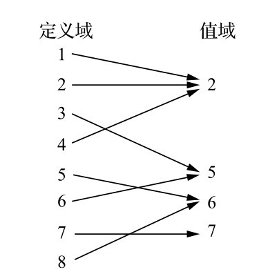 因为左边的每个数都恰好指向右边的一个数,所以我们可以说右边的这些数是左边的这些数的函数。可以将右边的这些数称为左边的这些数的“像”。这些箭头称为从定义域到值域的一个“映射”。也可以说这些箭头定义了函数的“对应规则”。