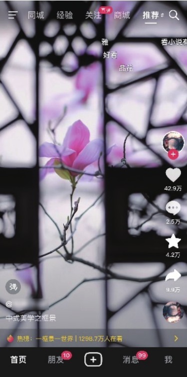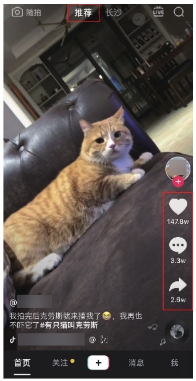 以抖音为例,抖音是一个以短视频为主要内容的社交媒体平台。它允许用户创建和分享短视频,并与其他用户进行互动。这种新颖的交流方式为人们提供了一个全新的社交平台,让用户可以更直接地分享生活、学习、娱乐等各种内容。用户上传自己的短视频后,平台往往会在首页进行推荐。热度越高(点赞量大、转发量大)的短视频在首页被推荐的次数会越多,从而可使更多的用户看到这条短视频,如图1-2所示。