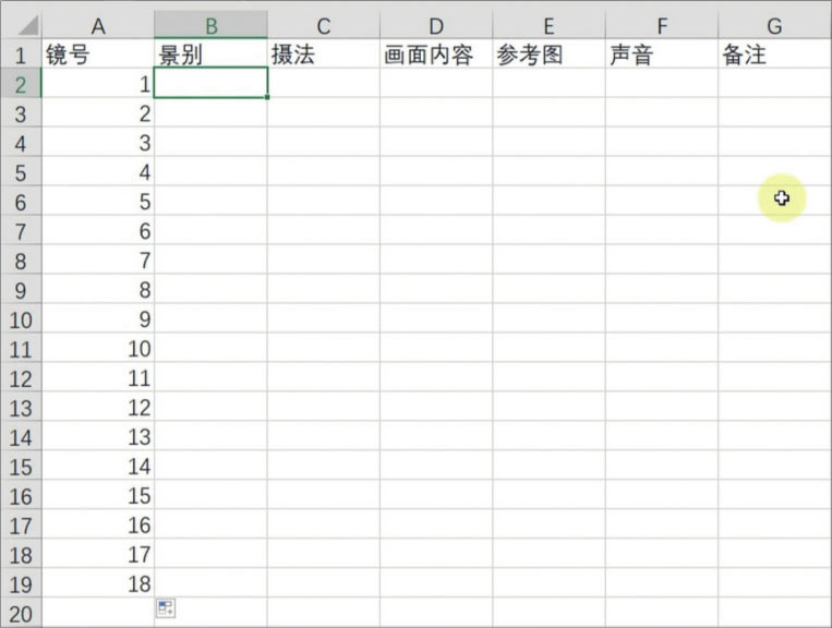 写分镜脚本并不麻烦,可以使用Excel或者Word。以Excel为例,新建一个Excel文件,制作的分镜脚本包含镜号、景别、摄法、画面内容、参考图、声音和备注等类目,如图1-12所示。